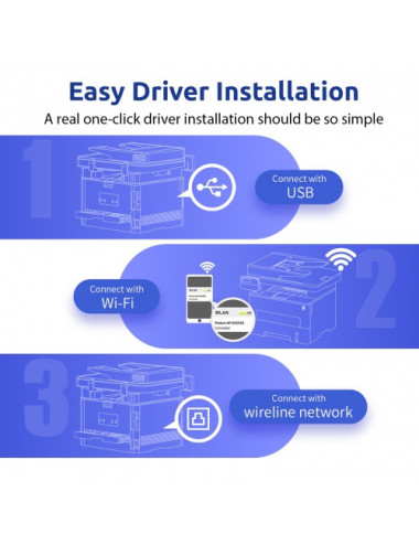 Laser | M7100DW | USB 2.0 | WiFi | ETH | Windows 10 | Windows 8 | Windows 7 | Linux | Paper size A4/210 C- 297 | Paper input 250 sheets | Paper output 150 sheets | Resolution 1200x1200 dpi | Print speed PPM 33 | Memory (RAM) 256MB | Duty Cycle 60000 Pages/month | Copy | Scan | Network W-LAN 802.11b/g/n | Dimensions 415 x 365 x 350mm